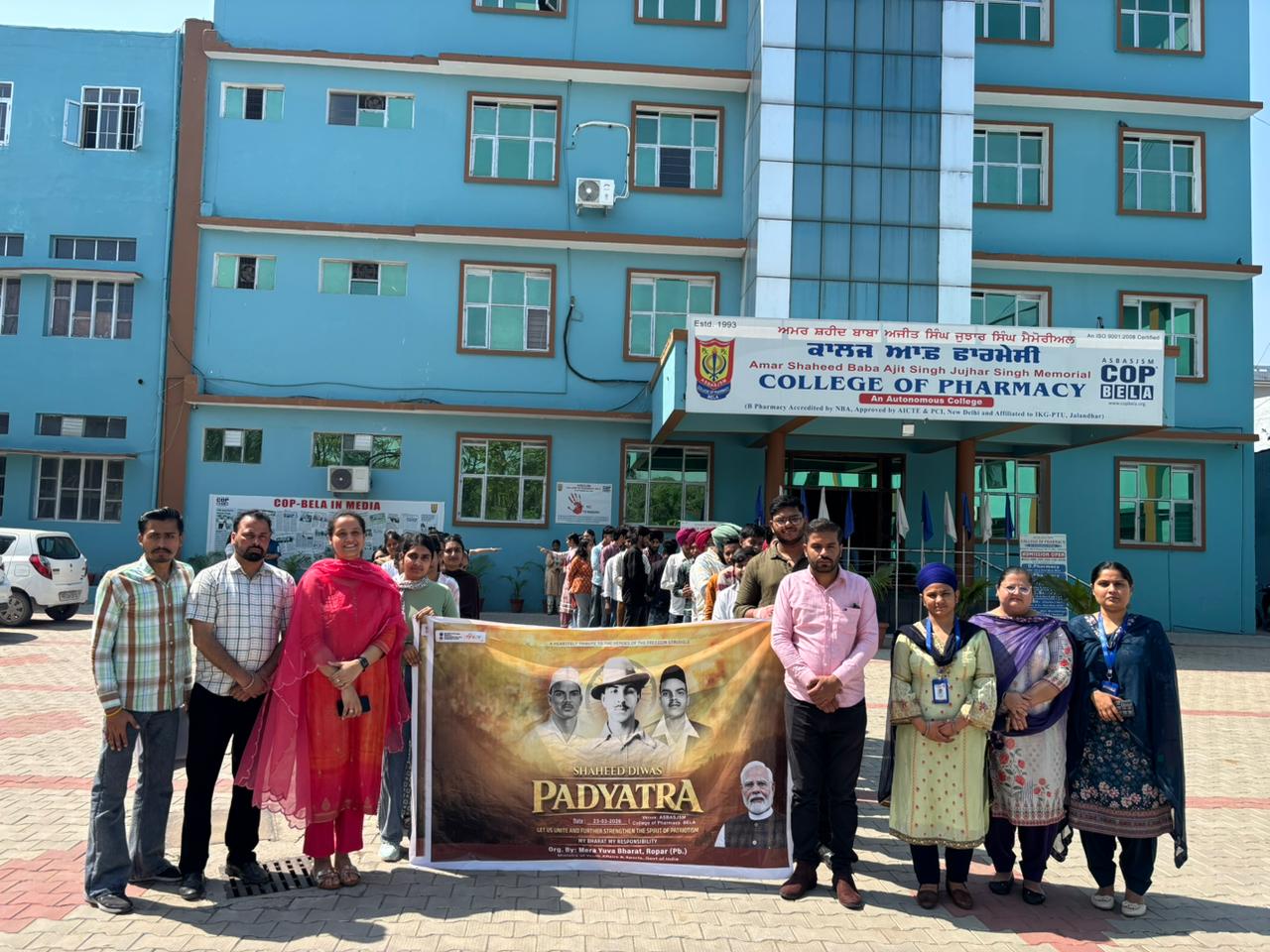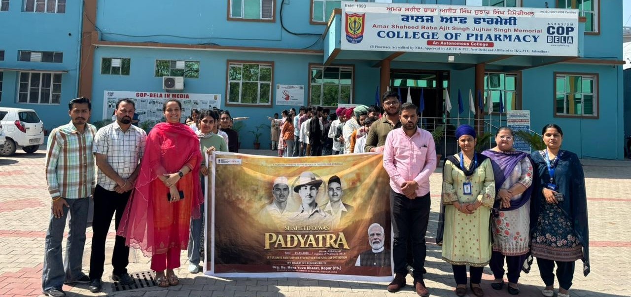 To mark the Martyrs’ Day of Shaheed Bhagat Singh, Rajguru and Sukhdev, a patriotic program was organized at Amar Shaheed Baba Ajit Singh Jujhar Singh Memorial College of Pharmacy, An Autonomous College, Bela. The event was conducted jointly by the Care and Cure Club under the coordination and Mera Yuva Kendra Sangathan.